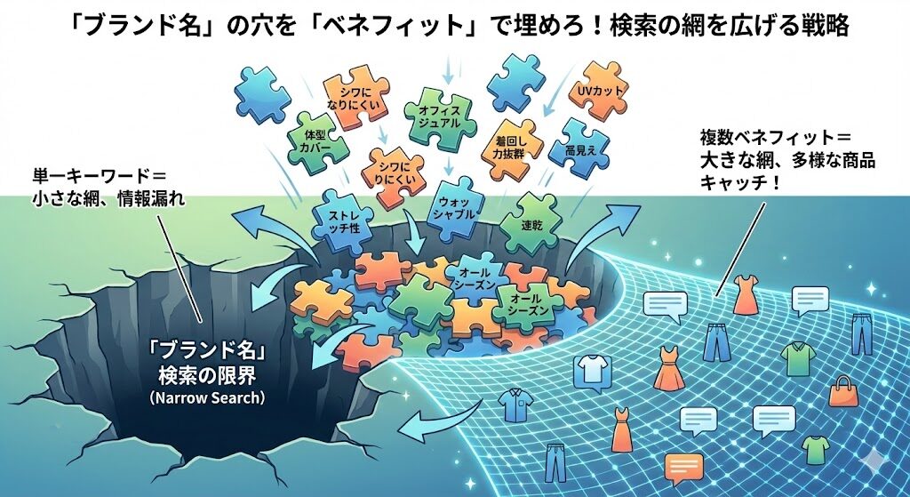 ノーブランド品を探しているユーザーは、特定のブランド名で検索しません。代わりに、自分の悩みや目的を解決する「言葉」で検索しています。これが、私が提唱する「ベネフィットキーワード戦略」です。