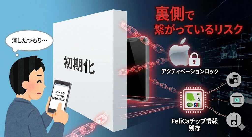 iPhoneの「すべてのコンテンツと設定を消去」というボタンは、万能ではありません。多くのユーザーが陥る罠は、「目に見えるデータ」は消えても、「端末とアカウントの紐付け」が残ってしまうことです。これを知らずに出品すると、以下のような致命的なリスクを背負うことになります。