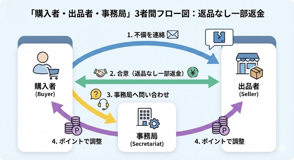 出品者にとっても、返品されると「送料負担」や「再出品の手間」が発生するため、一部返金(ポイント補填)での解決はメリットがあります。双方が「〇〇円分の補填で合意します」という意思表示を取引メッセージに残すことが、事務局を動かす絶対条件です。